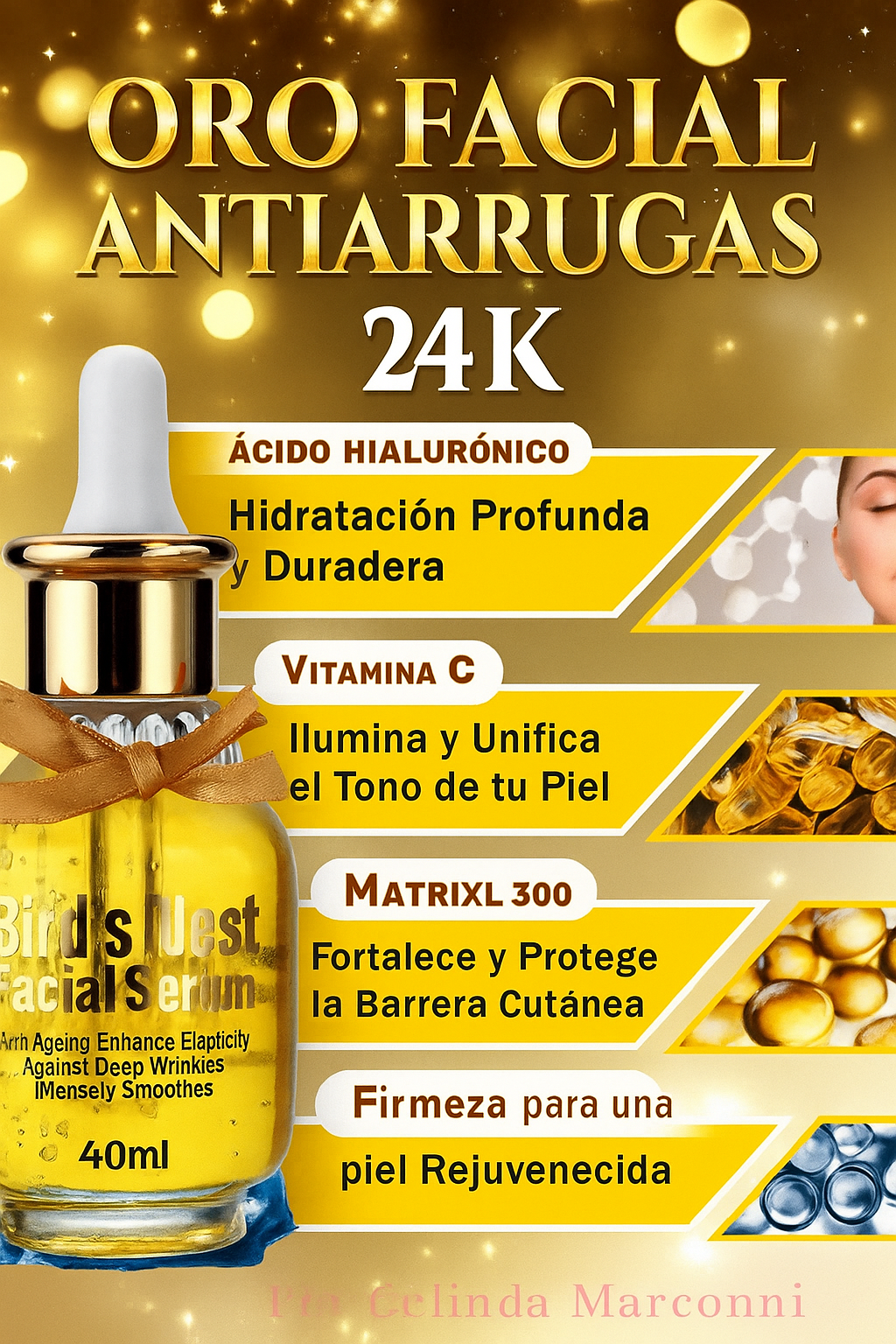 Desarrollado por los más reconocidos dermatólogos, Oro Facial antiarrugas es un Serum 24Kcon los mejores ingredientes antienvejecimiento, vitamina C y el Acido Hialurónico.Nuestro serum ofrece resultados visibles en semanas. Cada gota trabaja incansablemente para iluminar, reafirmar e hidratar tu piel